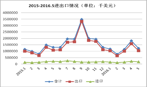圖1 2015年1月-2016年5月外貿(mào)進(jìn)出口總額走勢