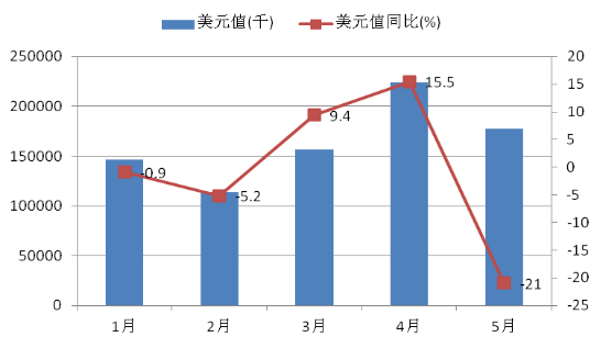 出口方面,在國際經(jīng)濟(jì)復(fù)蘇緩慢,國內(nèi)經(jīng)濟(jì)增速下降及我區(qū)主要貿(mào)易伙伴國經(jīng)濟(jì)不景氣和貨幣貶值的不利背景下,自治區(qū)外貿(mào)出口取得開門紅。前5月,自治區(qū)出口總額53.2億美元,同比增長8.2%,較去年同期增速加快29.7個百分點,比一季度增幅縮小2個百分點,增幅高于全國平均-2.9%的水平。出口增速呈現(xiàn)出較大波動,但總體呈增長趨勢。(見圖3)。