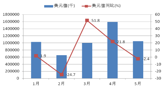 據(jù)海關(guān)初步統(tǒng)計,1-5月,全國進(jìn)出口總值9.16萬億元,同比(下同)下降3.2%。按美元計, 1-5月,全國進(jìn)出口總值1.41萬億美元,同比下降8.6%。5月當(dāng)月,全國進(jìn)出口總值2.02萬億元,增長2.8%。其中,出口1.17萬億元,增長1.2%;進(jìn)口0.85萬億元,增長5.1%;順差3248億元,下降7.7%。按美元計,5月當(dāng)月,全國進(jìn)出口總值3121億美元,下降2.6%。1-5月外貿(mào)運行主要呈以下特點:一是出口保持小幅增長,進(jìn)口實現(xiàn)正增長。二是對主要經(jīng)濟(jì)體出口回落,對巴西和澳大利亞進(jìn)口增長加快。三是一般貿(mào)易占比有所提升,其他貿(mào)易較快增長。四是勞動密集型產(chǎn)品出口好于機電產(chǎn)品,部分大宗商品進(jìn)口量升價跌。五是民營企業(yè)對出口增量貢獻(xiàn)最大,國有企業(yè)進(jìn)口由降轉(zhuǎn)增。六是東中部地區(qū)進(jìn)出口好于全國,西部地區(qū)進(jìn)口增長較快[2]。