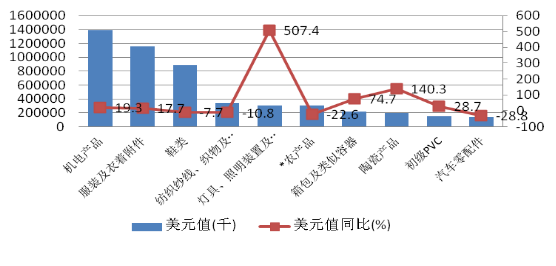 出口主要商品中,以機電產(chǎn)品、服裝、鞋類和燈具等傳統(tǒng)出口優(yōu)勢產(chǎn)品結(jié)束了2015年的下滑趨勢,均出現(xiàn)不同程度回暖。按貿(mào)易額機電產(chǎn)品、鞋類、服裝、農(nóng)產(chǎn)品和紡織制品占據(jù)前5位,降幅最大的3種商品是服裝、箱包和PVC材料,出口量分別下降48.9%、52.0%和24.1%,出口額分別下降48%、46.5%和40.8%,體現(xiàn)為量價齊跌態(tài)勢。以高新技術(shù)產(chǎn)品、汽車零件等為代表的高附加值產(chǎn)品出口在持續(xù)多年的連續(xù)增長后,自2015年起開始出現(xiàn)下滑(見圖6)。