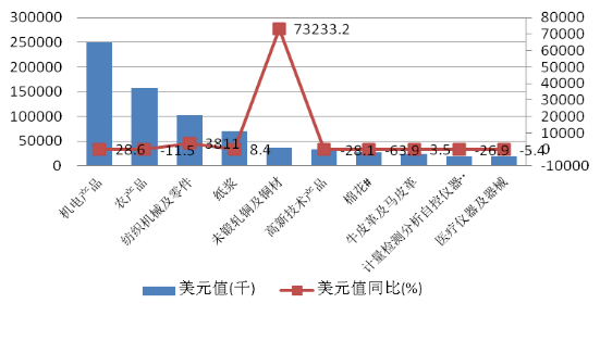 在鼓勵外資政策措施的引導(dǎo)下,我區(qū)外商投資企業(yè)和中外合作企業(yè)積極調(diào)整產(chǎn)品結(jié)構(gòu),努力拓展?fàn)I銷渠道,深度開發(fā)國際市場,取得良好效果。同時,作為新疆外貿(mào)主力軍的民營企業(yè)進(jìn)出口仍占據(jù)主導(dǎo)地位。1-5月,呈現(xiàn)“國退民進(jìn)”態(tài)勢,國有企業(yè)進(jìn)出口總額8.1億美元,同比下滑19.8%,民營企業(yè)進(jìn)出口122.1億元,同比增長13.7%,高于整體降幅6.9個百分點,占進(jìn)出口總額的84.6%,(見圖9)。外資企業(yè)較有起色,其中,外商獨資企業(yè)進(jìn)出口40803美元,同比增長12.8%。