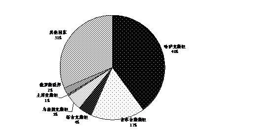 從貿(mào)易市場結(jié)構(gòu)看,主要貿(mào)易伙伴中亞五國中,除了吉爾吉斯外,對其余四國貿(mào)易額全部下降。1-5月,新疆與哈薩克斯坦貿(mào)易額44.3億美元,同比下降38.7%,對吉爾吉斯貿(mào)易額23.7億美元,下滑16.1%。對哈薩克斯坦、吉爾吉斯斯坦兩國貿(mào)易占我區(qū)外貿(mào)總值的47.1%。占比較去年同期下降5.6個百分點,是新疆最大的兩個貿(mào)易伙伴國。1-5月,新疆與中亞五國和俄羅斯貿(mào)易額92.5億美元,占新疆進(jìn)出口總額的64.1%,占比較去年同期下降13.2個百分點(見圖7)。