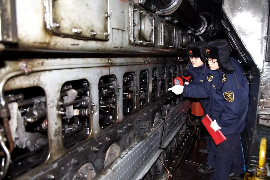 海關(guān)工作人員正對(duì)中歐班列牽引機(jī)車(俗稱機(jī)頭)進(jìn)行登臨檢查